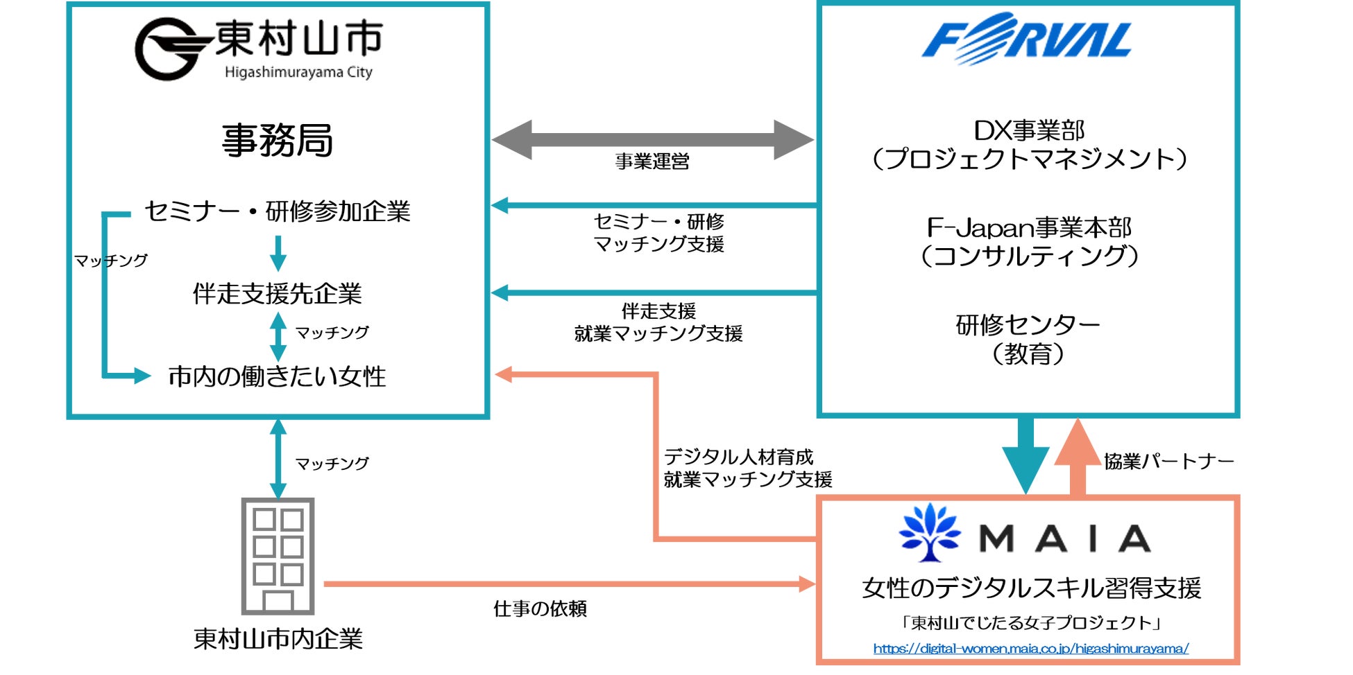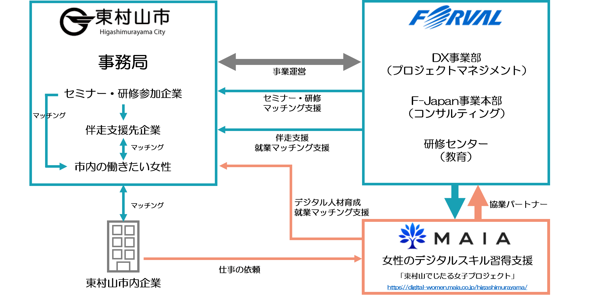今回の業務委託では、東村山市内の中小企業が抱える経営課題を解決するために、伴走型経営コンサルティング(次世代経営コンサルティング)を提供し、DX推進をサポートいたします。さらに、東村山市在住の女性に対し、ITスキルなど市場価値の高いデジタル教育を提供し、同一委託内で支援する市内中小企業を優先とした就業・就労支援に取り組むことで、収入向上と市内雇用創出・多様な働き方を推進しているまちとしての価値の向上を図ります。