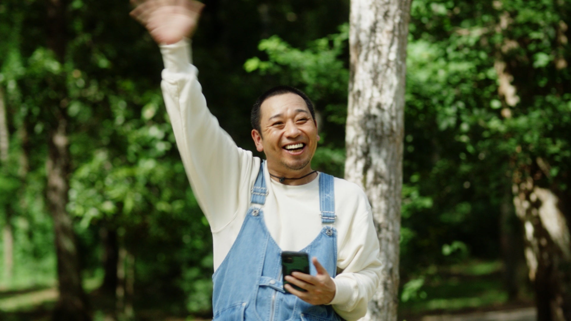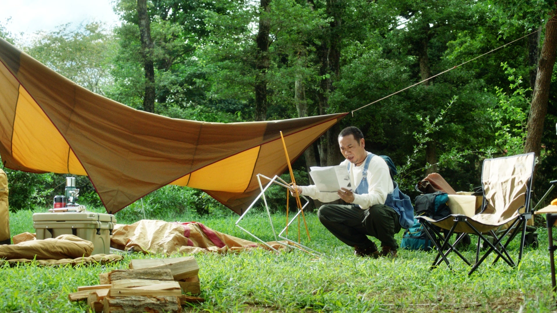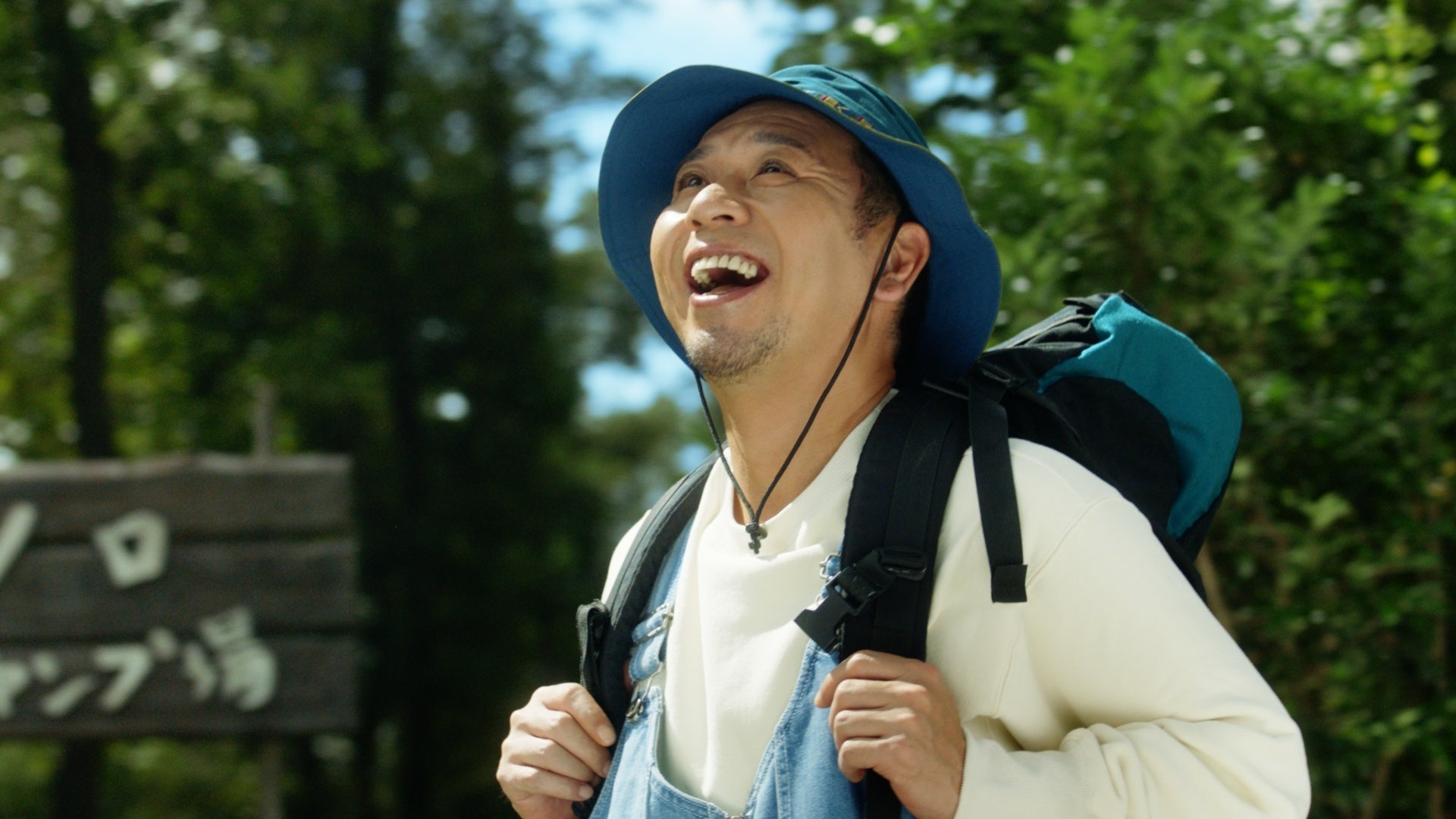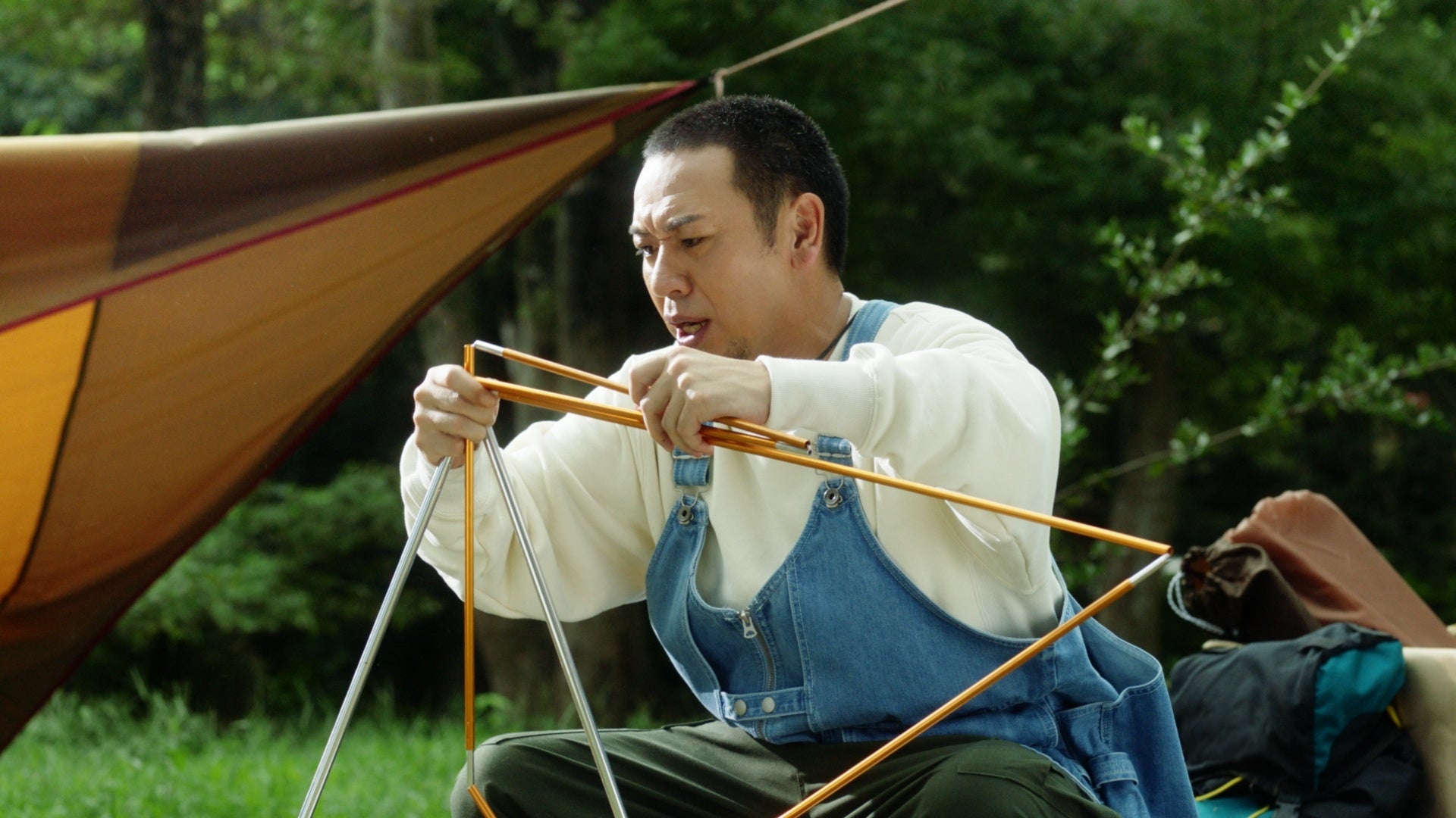 撮影当日は、真夏の陽気が続きセミの鳴き声が響き渡るなか、山奥のキャンプ場を借りた撮影となりましたが、ロケ撮影ということもあり、おふたりとも自然のなかで風を感じながら、終始和やかな雰囲気で撮影は進んでいきました。大悟さんは、シーン毎に監督と細かい動きや台詞部分について、入念に打ち合わせをしながら撮影に臨んでいる姿が印象的でした。また撮影の合間にはハンモックに揺られながら、キャンプのワンシーンを楽しまれる一面も。ノブさんは現場にいたスタッフやエキストラの方と談笑しながらも、本番では優しさのなかにキレのあるツッコミを決めてくれました。