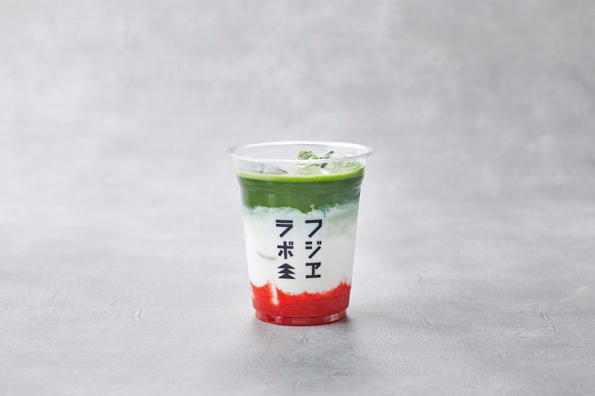 『手点て抹茶ラテ』にイチゴとフランボワーズのピューレを合わせた『フジヱラボ エキュート立川店』限定ドリンク。抹茶の旨みに2種のベリーの爽やかな甘みが合わさった贅沢な味をお楽しみいただけます。