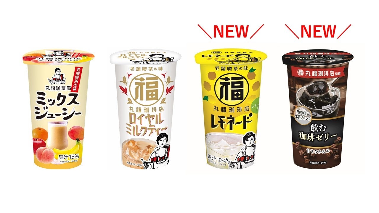 丸福珈琲店監修のシリーズ商品として、丸福珈琲店監修「ミックスジューシー」「ロイヤルミルクティー」も発売中。また、この春より「レモネード」「飲む珈琲ゼリー」も新発売します。様々な味わいをお楽しみください。