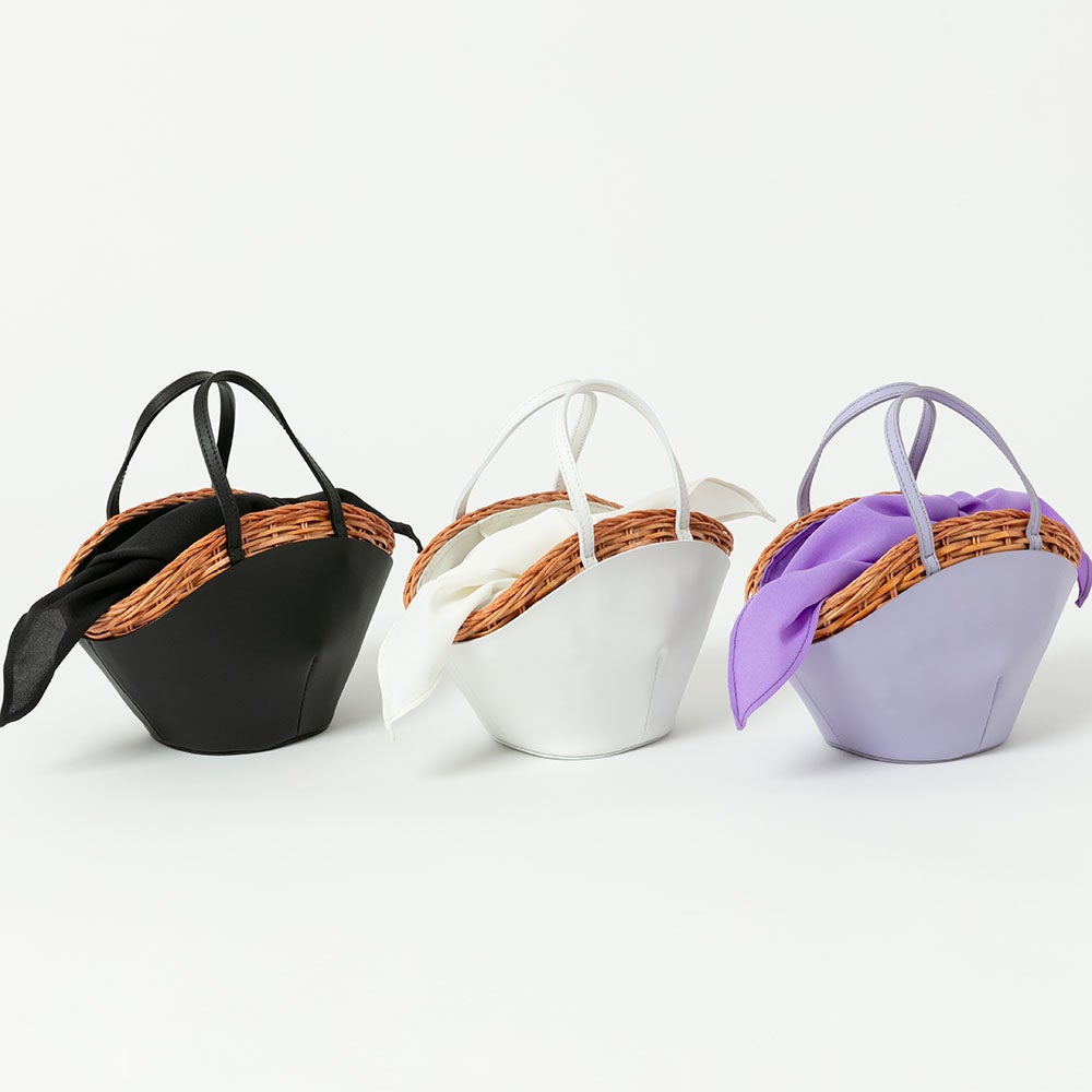 口が広く物が取り出しやすいマルシェ型のカゴバッグをオフィシャルサイトで先行予約受付中。レザーとラタンのコンビネーションの程よいカジュアル感がポイント。取り外し可能なストラップ付で持ち方に変化を付けられます。折り畳み財布やスマホなどの荷物がしっかり入り、上部は結んで中身を隠せるので安心です。