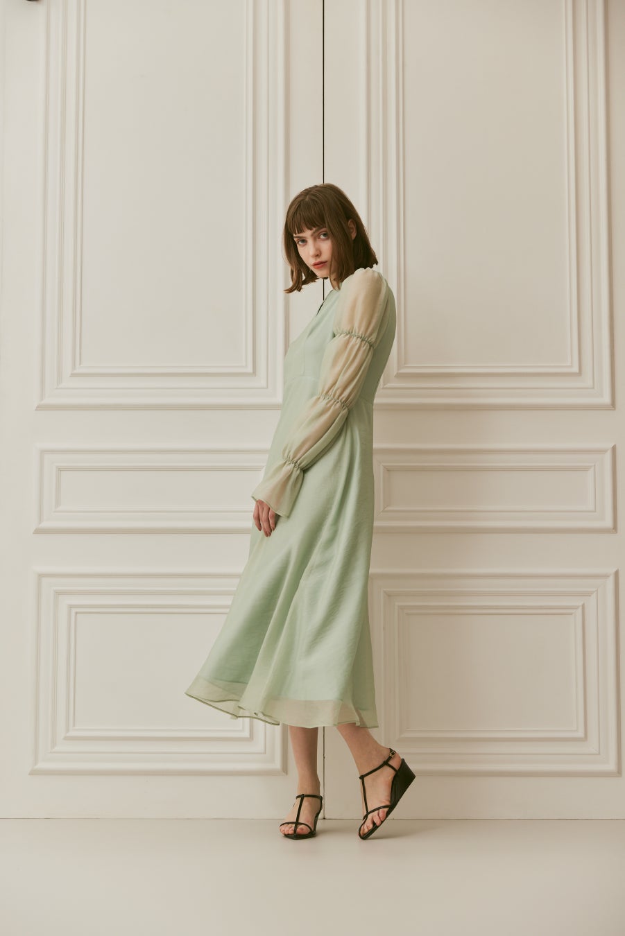 トレンドのシアー素材を使用したドレスは、あえてシワ感を出したワッシャー加工を施したニュアンスのある表情が新鮮。オフィシャルサイト限定カラーは春らしく洗練された印象のグリーン。女性らしさを引き立てるエレガントで華やかなアイテムです。