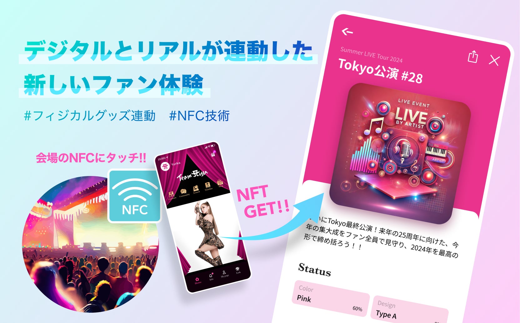 NFC技術を利用したフィジカルグッズ連動や、LIVEイベントでのNFT配布を通じて、ファンはデジタルとリアルの境界を超えた新しいエンターテイメント体験を享受できます。イベントの来場証明やスタンプラリー、チケット半券もアプリと連動し、新たな体験を提供します。
