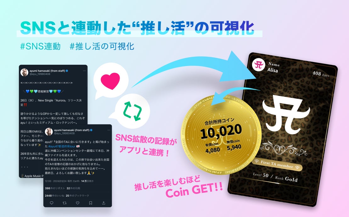 ファンがSNSでアーティストの投稿をいいね・拡散することで、ファンクラブ内で使えるコインを受け取れる新機能を実装します。ファンクラブ外での推し活(貢献)を可視化し、アプリに連動させることで、ファンの想いがアーティスト活動を後押しします。