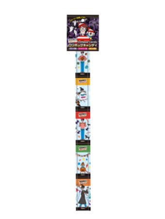 商品特徴:グレープ・ストロベリー・オレンジの3種類の味を楽しめるロリポップアソート。個包装にもウォーリーがデザインされており、吊り下げ台紙に描かれているイラストではウォーリーをさがして遊ぶことができます。