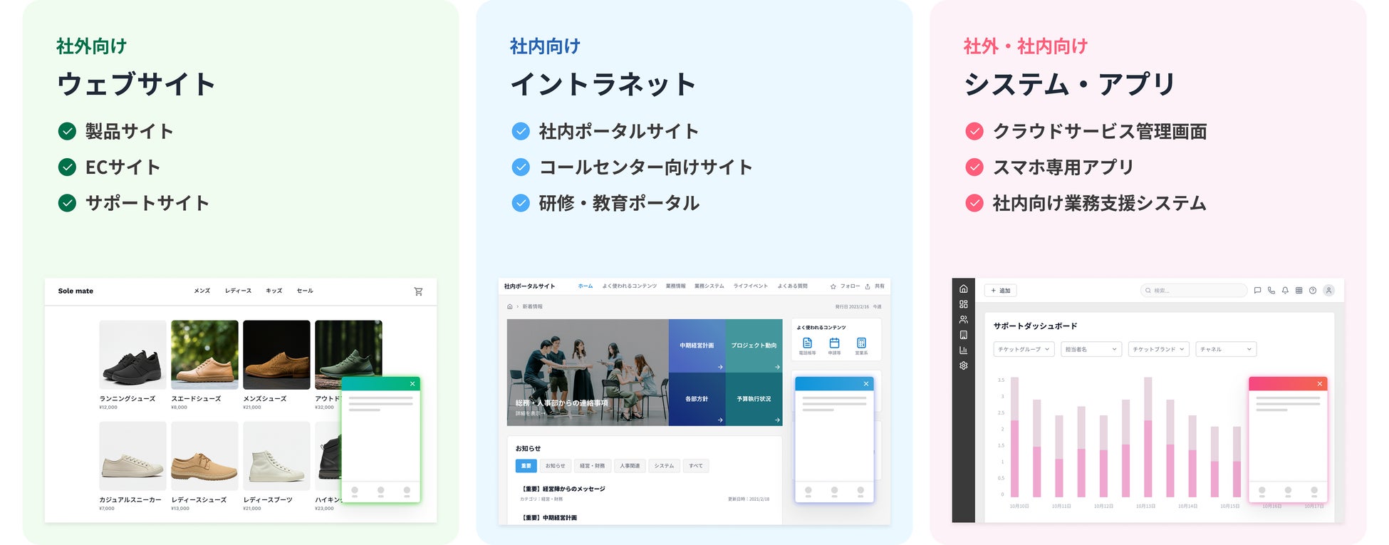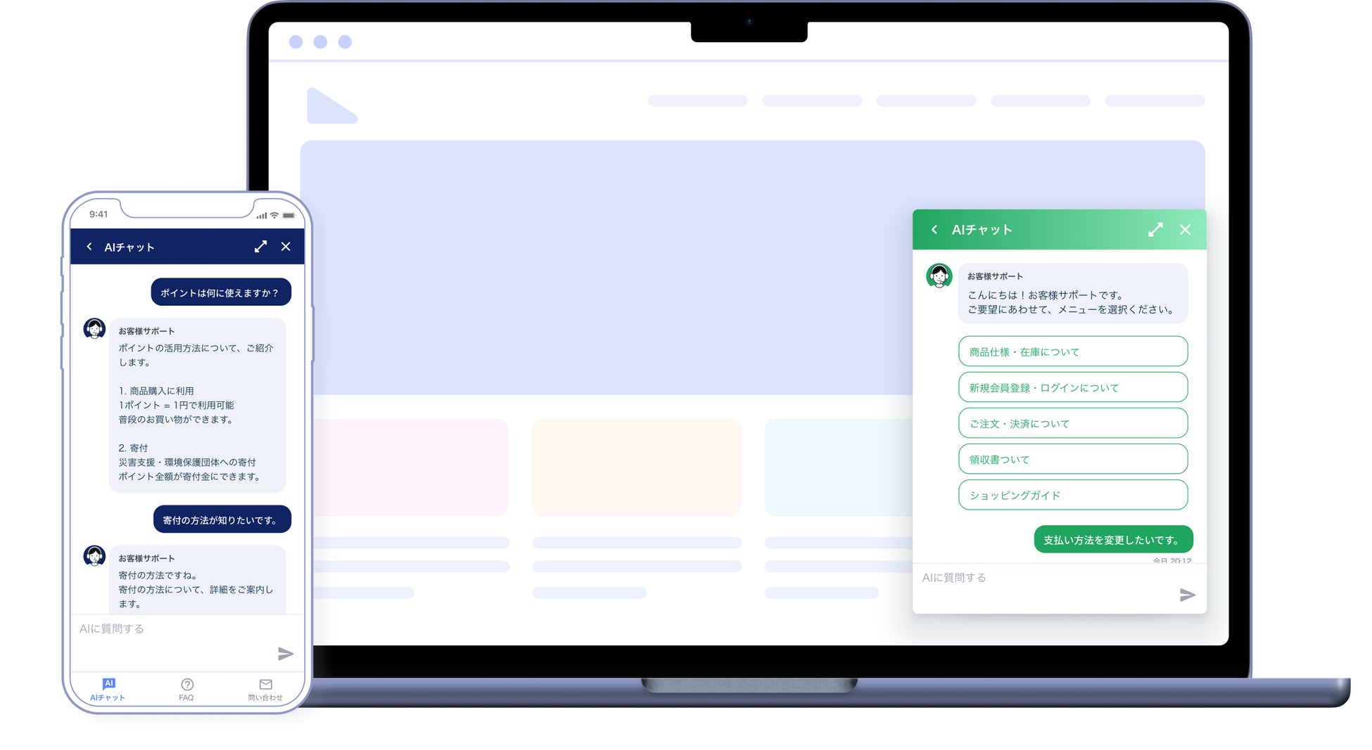 AIチャットボットを製品サイトやECサイトに設置することで、購入前後の問い合わせに自動で対応し、利用者が必要な情報にすぐたどり着ける環境を提供します。社内のポータルサイトや業務システム内に設置することで、人事・総務・情報システムなどへの問い合わせ対応を効率化し、従業員が自ら解決できる体制づくりを支援します。