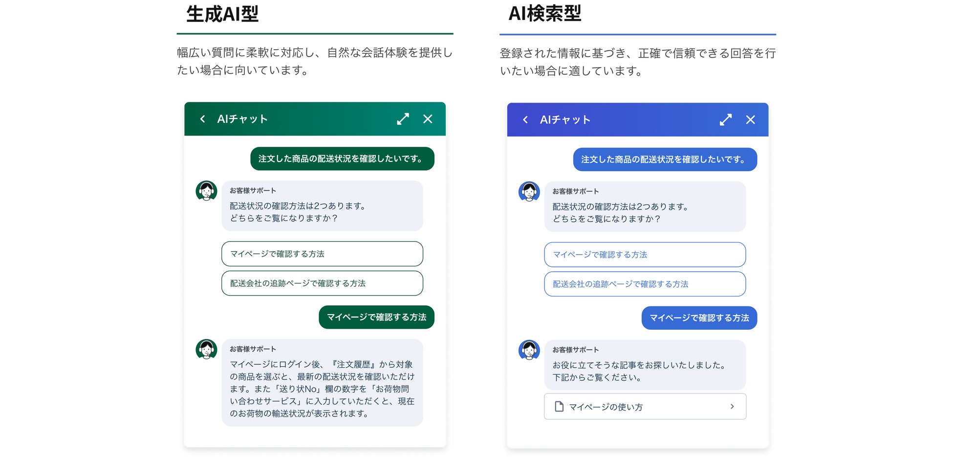 今回提供を開始したAIチャットボットは、「生成AI型」と「AI検索型」の2種類から選択して利用できます。「生成AI型」は、利用者との会話の文脈や意図を理解し、必要に応じて質問を聞き返しながら最適な回答を導き出します。人に話しかけるような自然な対話を実現し、利用者の課題をスムーズに解決へ導きます。一方の「AI検索型」は、FAQサイトの記事やPDFファイルなどのマニュアル情報から関連性の高い内容を正確に提示することで、誤回答や情報のゆれなどのハルシネーションを防ぎ、信頼性を重視した運用に適しています。