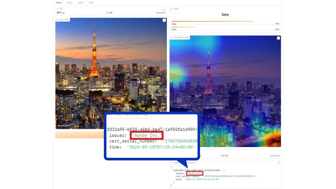 AIで生成されたデータであることを示すコンテンツ認証情報が含まれた画像を入力した際は、その画像の出自情報等が含まれた認証情報をフェイク検出のアプリケーション上で確認することが可能です。これにより、当社のフェイク検出器(Fake Detector)はさらなる検出機能の向上を実現しました。