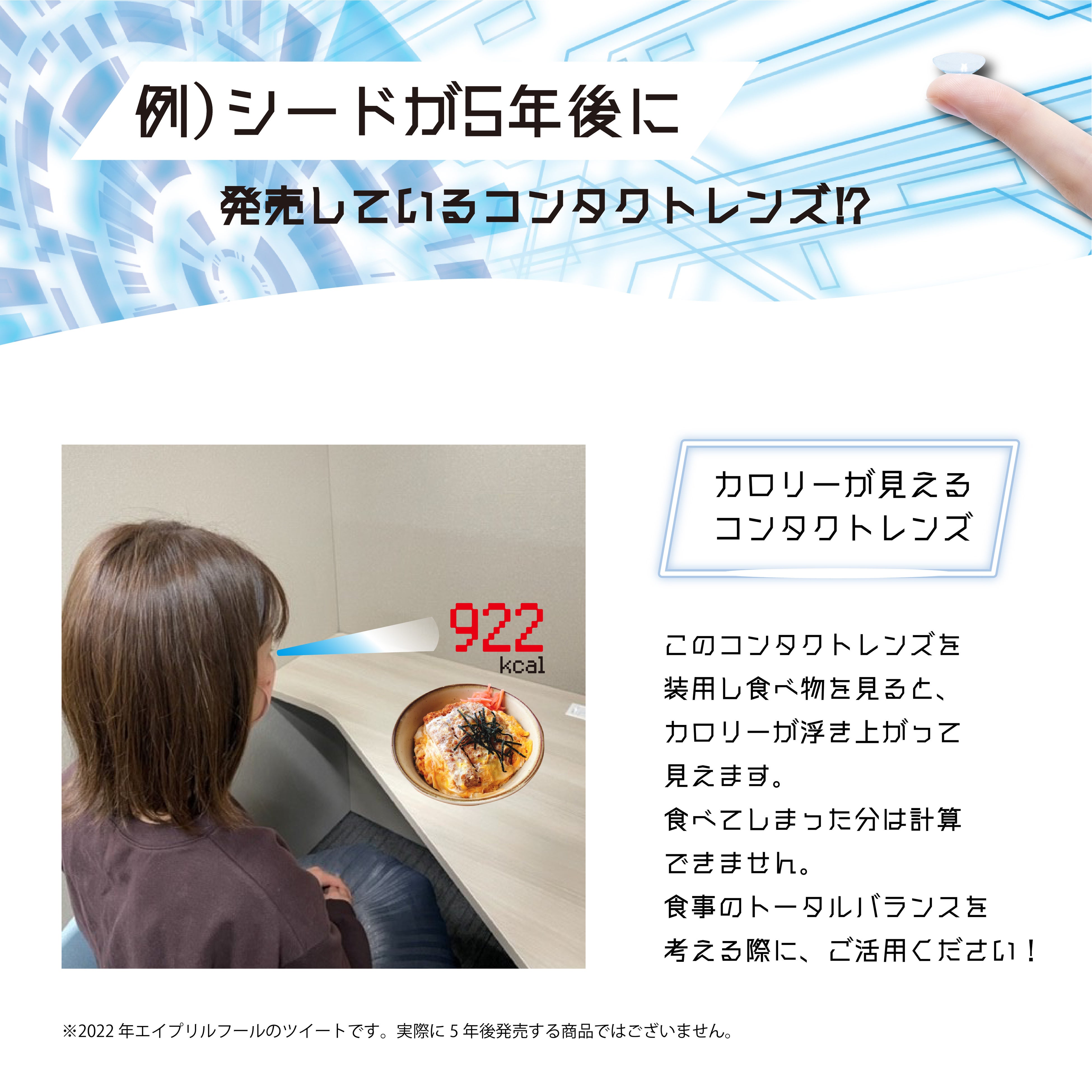 株式会社シード広報公式Twitterアカウント「@SEED_koho」をフォロー、該当ツイートに当社が5年後に発売しているコンタクトレンズを予想しコメントの上、引用リツイートで投稿してください。
