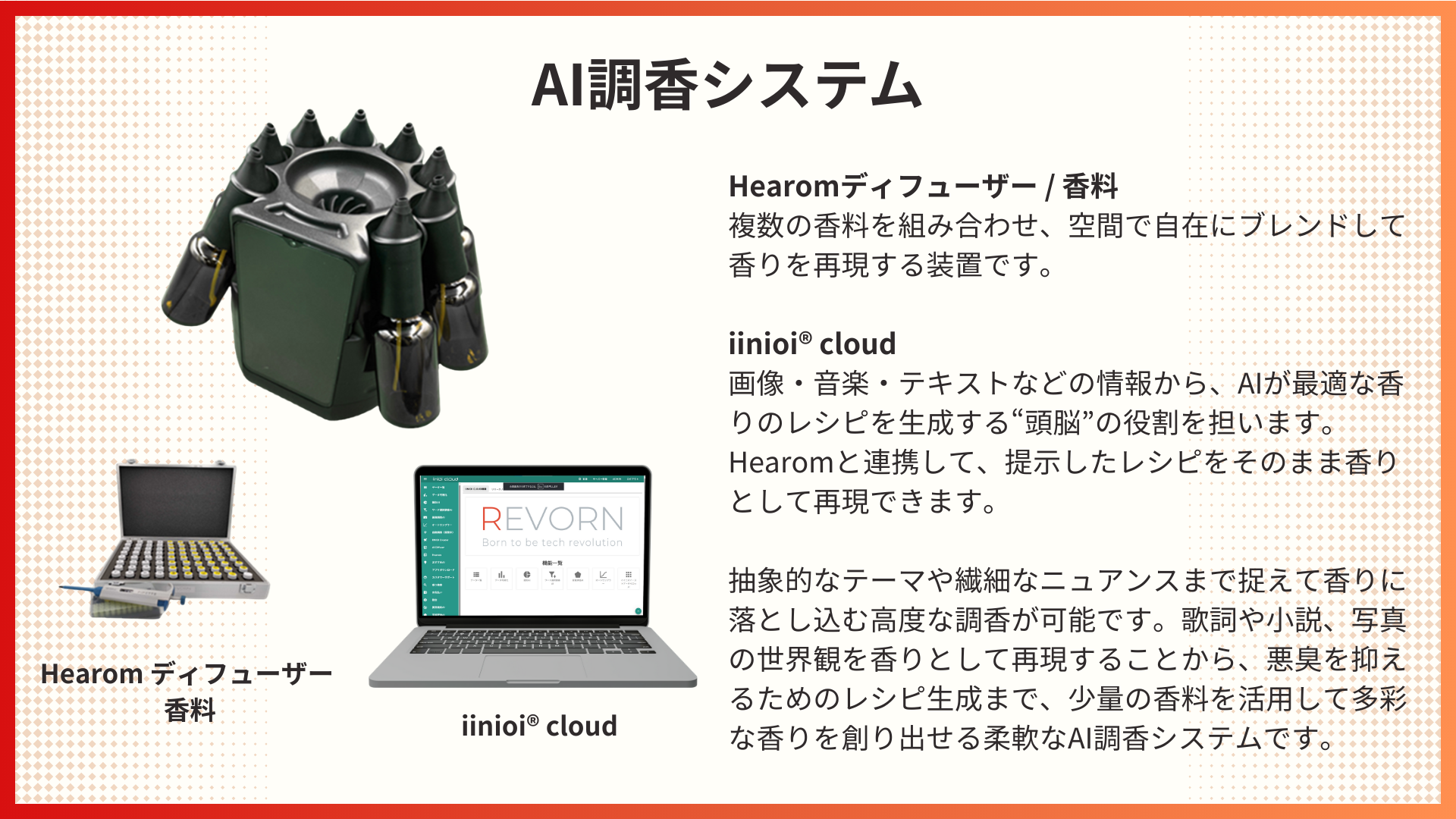 レボーンは、独自のにおいセンシングシステムやAI調香システムを開発し、