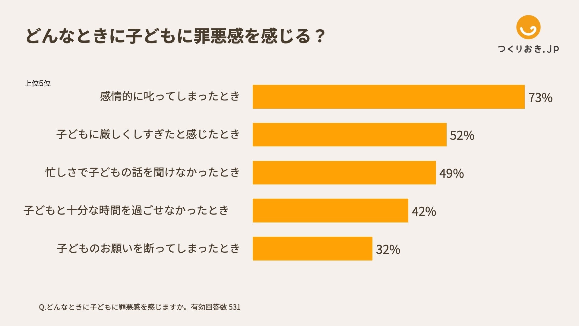 母親が子どもや家族に抱く罪悪感のことを「マミーギルト」といいます。罪悪感を感じる場面としては、「感情的に叱ってしまったとき」(73%)や「子どもに厳しくしすぎたと感じたとき」(52%)など、叱り方に関するものが上位に挙げられました。また、「忙しさで子どもの話を聞けなかったとき」(49%)や「子どもと十分な時間を過ごせなかったとき」(42%)など、時間的な余裕のなさも要因となっているようです。