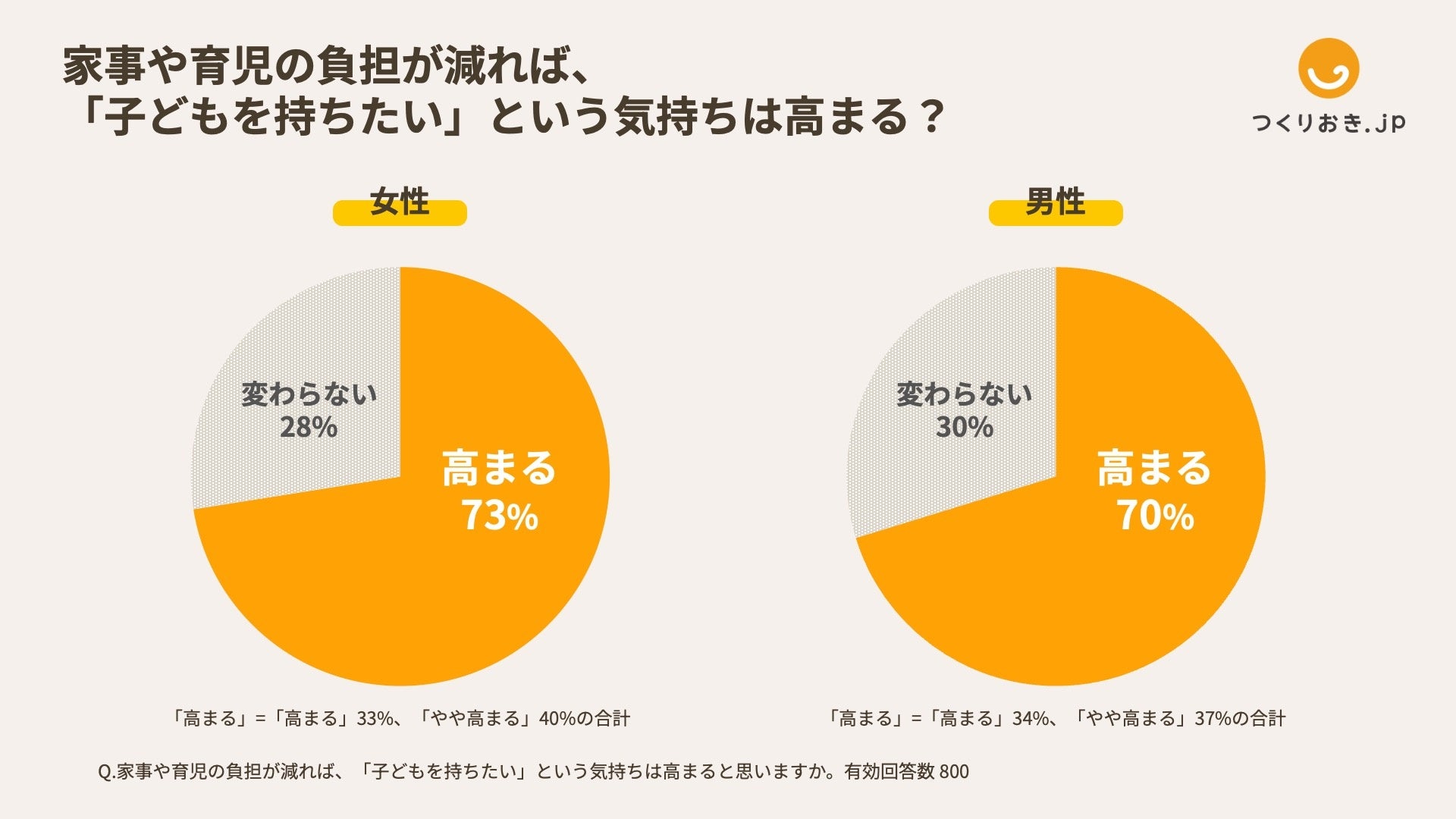 さらに、「家事や育児の負担が減れば、『子どもを持ちたい』という気持ちは高まると思いますか」との質問には、女性の73%、男性の70%が「高まる」(「高まる」と「やや高まる」の合計)と回答しました。合計特殊出生率が過去最低を記録する現状において、家事・育児の負担軽減が出生意欲を高める一助となる可能性が示唆されています。