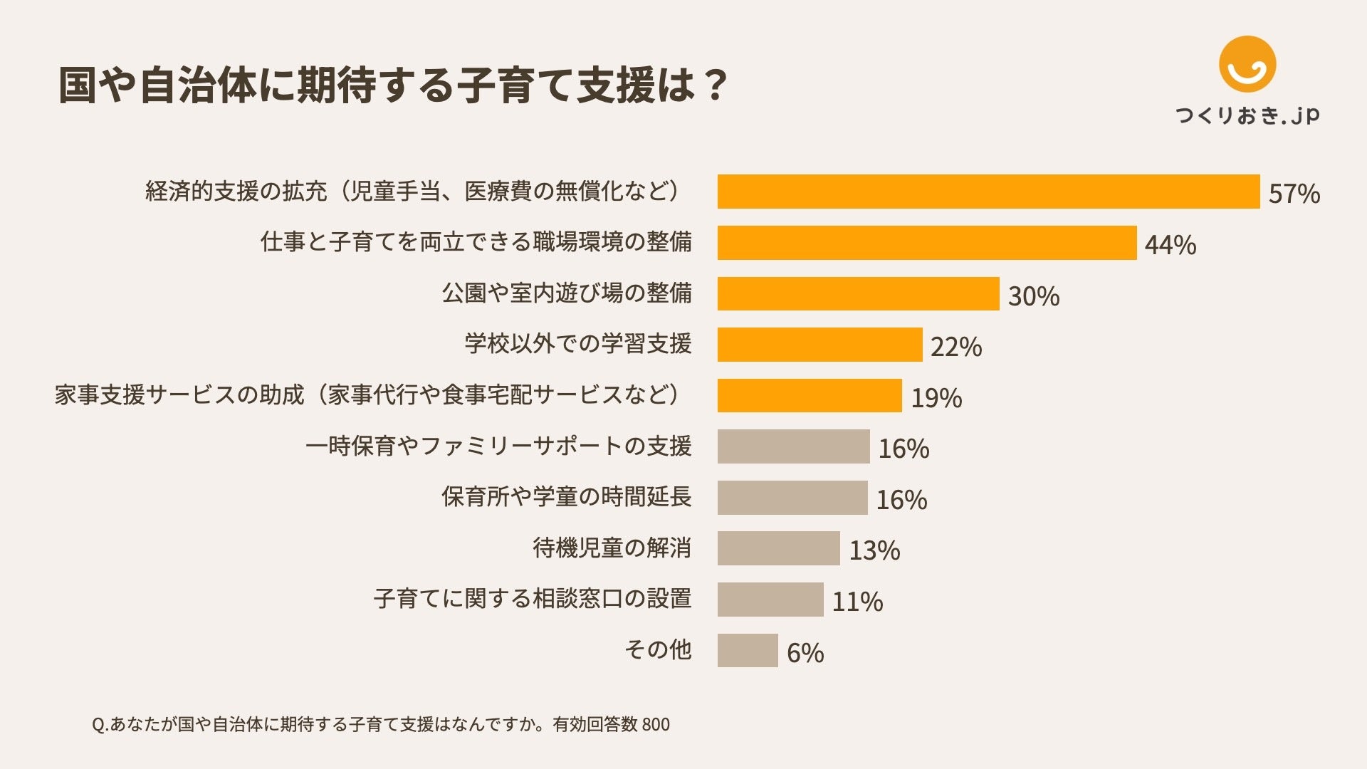 国や自治体に期待される支援策としては、「経済的支援の拡充」(57%)が最も多く挙げられ、「仕事と子育てを両立できる職場環境の整備」(44%)や「家事支援サービスの助成(家事代行や食事宅配サービスなど)」(19%)も上位に挙がりました。共働き世帯が増加する中で、仕事と家事・育児の両立を支える具体的な支援策が強く求められていることがうかがえます。