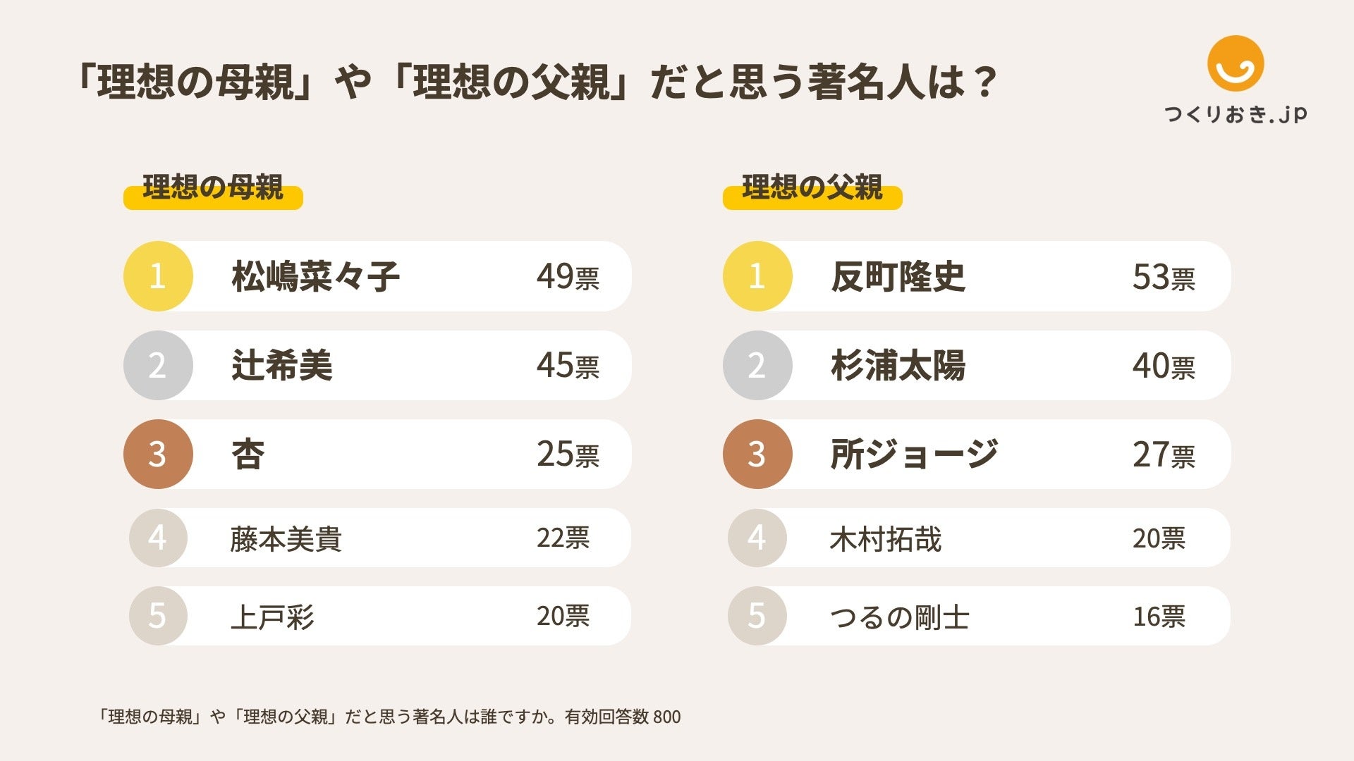 アンケートで「理想の母親・父親」を調査しました。「理想の母親」には松嶋菜々子さん、辻希美さん、杏さんがトップ3に選ばれ、「理想の父親」では反町隆史さん、杉浦太陽さん、所ジョージさんが選出されました。1位と2位は夫婦揃ってのランクインとなりました。