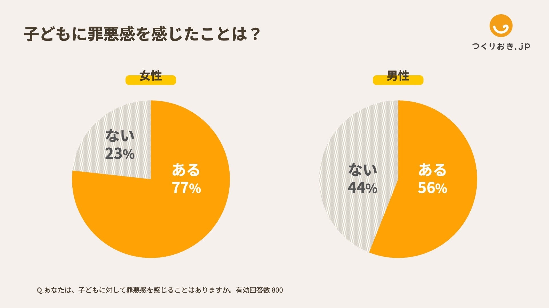 子どもに罪悪感を感じたことのある母親が77%で、男性(56%)よりも高い傾向