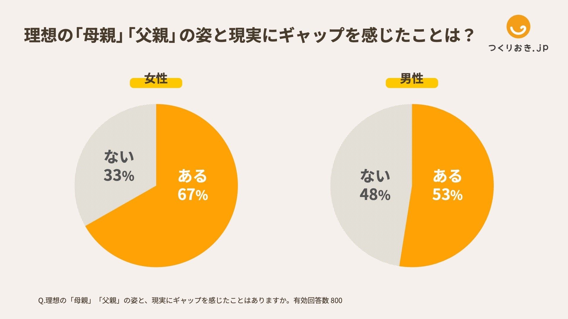 さらに、「理想の母親・父親との姿と、現実にギャップを感じたことはありますか」という質問に対しては、母親の67%が「ある」と回答し、父親(53%)よりも高い結果になりました。