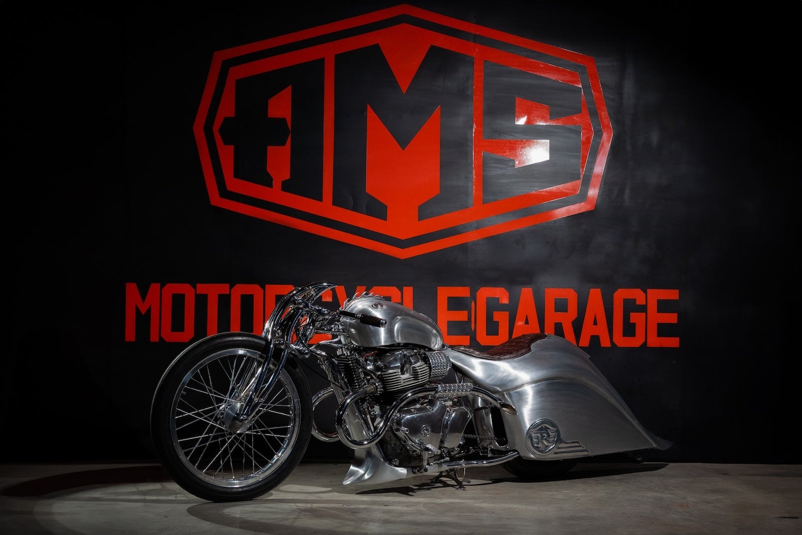 ベースマシンはSUPER METEOR 650。「PHOENIX(フェニックス)」と名付けられたこのカスタムバイクを製作したのは、インドネシアのAMSガレージです。PHOENIXはギリシャ神話に登場する再生のシンボル。ハンドメイドによって仕上げられたアルミ製の燃料タンクとリアカウルが美しくつながり、そのラインがフェニックスに似ていることから命名されました。エアサスペンションをセットしたガーダーフォークやハードテールのフレームはオリジナル。その細部に至るまでハンドメイドによる装飾が施されています。
