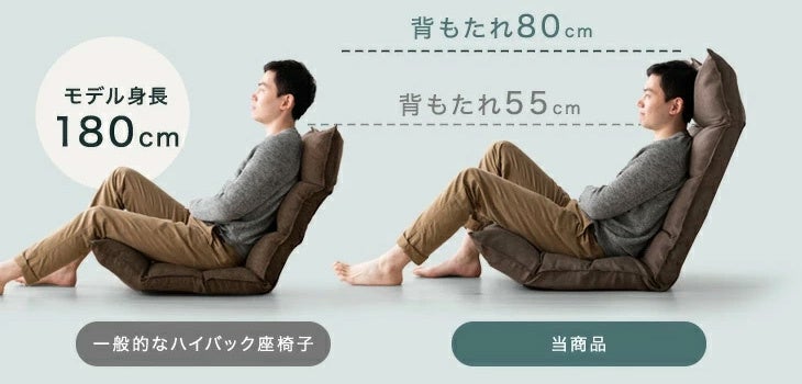 「Rococo premium」は、『一般的な背もたれの座椅子の高さでは頭まで支え切ることができない』『もう少し背もたれが長かったら…』といったお客様からのご意見により生まれました。背もたれの高さを一般的な55cmから80cmにしたことで、高身長の方でも頭をしっかりと支え首の負担を軽減するため長時間座っても疲れずにくつろぐことができます。