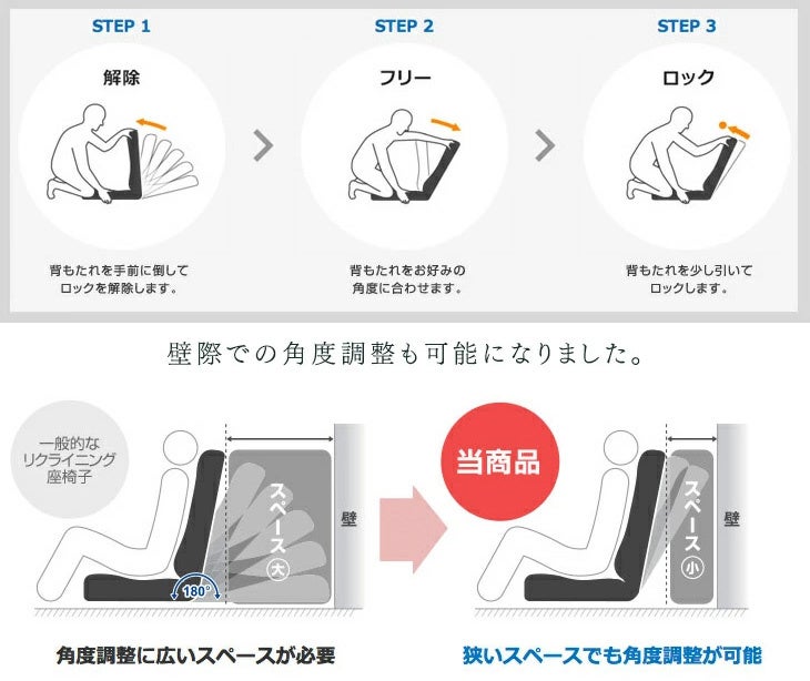 背もたれが長くなったことで、座椅子のリクライニング操作により広いスペースが必要でしたが、“フリーロック機能”を搭載したことで、座椅子後方にスペースが少なくてもリクライニングが可能となりました。また、一度水平な状態まで背もたれを倒す煩わしい操作をする必要もなくなりました。