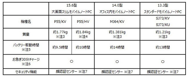 「dynabook SJ73」は筐体にアルミニウム素材を用いることにより、13.3型で軽さ約1.21kg※注3を実現。PC基板の高密度化によりフットプリントを小型化するとともに、液晶画面の狭額縁化も進め、手軽に持ち運べるスリムでコンパクトボディに仕上げました。「dynabook MJ64」は14型液晶を搭載しながら、フットプリントの小型化&狭額縁化により13.3型並みの筐体サイズを実現。資料も見やすい14型画面ながら持ち運びもしやすくテレワークにも適しています。「dynabook P55」は薄さ約19.9mmのコンパクトボディ、15.6型の液晶を搭載し大画面で作業もでき、スリムなデザインで約1.77kg※注3~約1.84kg※注4と持ち運びもスムーズです。「dynabook P55」は約9.5時間※注5~、「dynabook MJ64」は約14時間※注5、「dynabook SJ73」は約13時間※注5と軽量ながら長時間バッテリー駆動も実現しています。