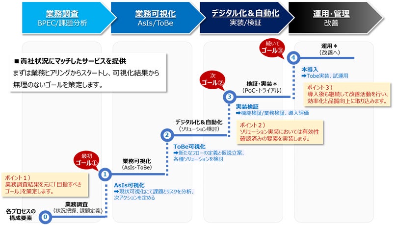 そのような課題ニーズを受け、当社が一連の検証工程を担い、運用安定化へ一気通貫で伴走支援することをコンセプトにサービス化。企業の事務業務変革の成功を力強くサポートします。