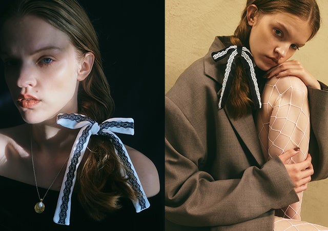 リボンの中央には繊細で雅やかなレースが。装いにクラシカルで知的なイメージを上乗せできます。
