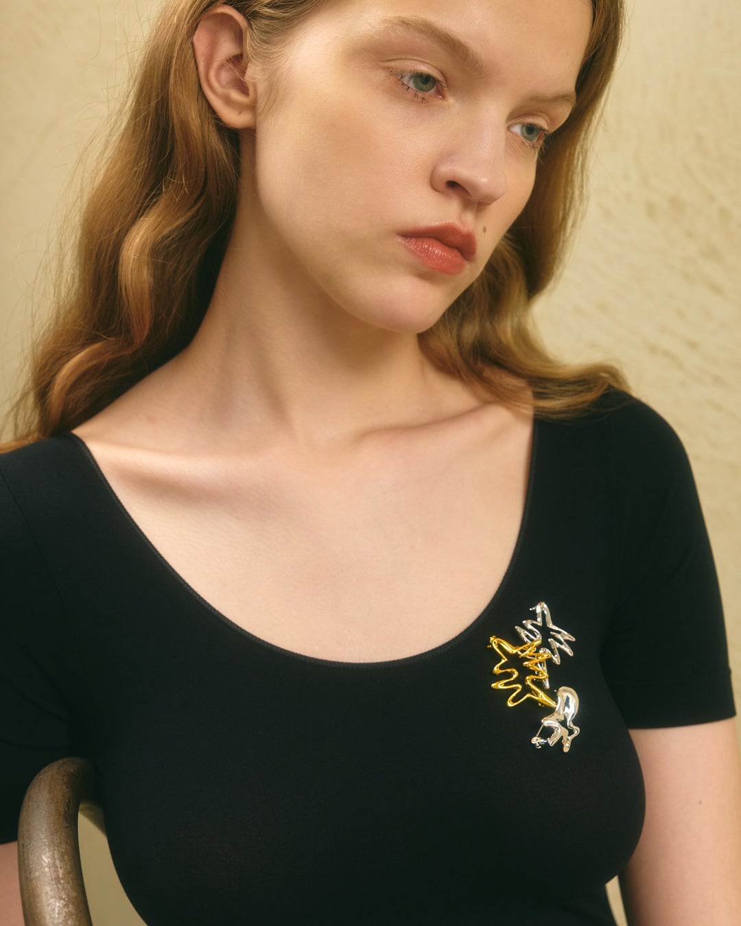 複数のブローチを組み合わせて着用すると、より高感度な見た目に。