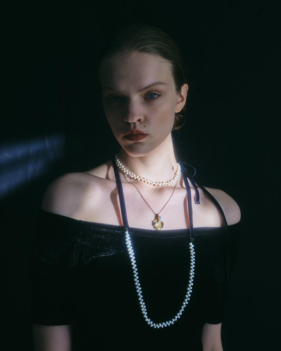 柔らかに艶めく淡水パールと滑らかなベロアのリボンを合わせた、高貴な表情のネックレス。