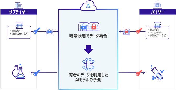 化学業界サプライチェーンでは、サプライヤーとバイヤーは、ともに開発に関する生データ(配合条件、加工条件、測定・分析結果など)を秘匿しながら定性的情報を主としてやり取りする「すり合わせ」作業を通じて、化学製品などの取引を行っています。一方で、多様化するニーズや開発サイクルの短縮化、人手不足を背景としたR&D活動の効率化を求める動きなどにより、「すり合わせ」作業の回数削減や高度化の実現が課題となってきています。こうした流れの中でR&D活動であるMI(マテリアルズインフォマティクス)※1の活用が進む中、各企業の有する様々なデータの中から、効率よく必要なデータを見つけ、MIで簡単に処理できるようデータそのものを加工する技術へのニーズが高まっています。