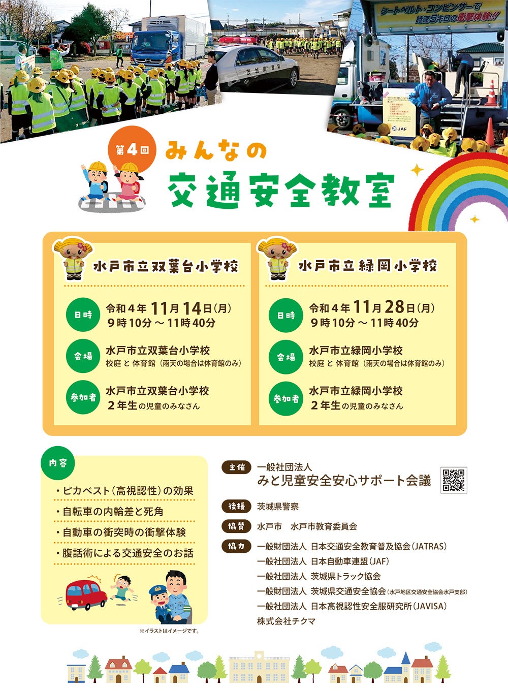衣服を通して豊かなこころを育む「服育」を提唱する株式会社チクマ(本社:大阪市中央区、代表取締役社長:堀松 渉)では、この度、水戸市の双葉台小学校、緑岡小学校で開催された(一社)みと児童安全安心サポート会議が主催する「みんなの交通安全教室」に参加しました。