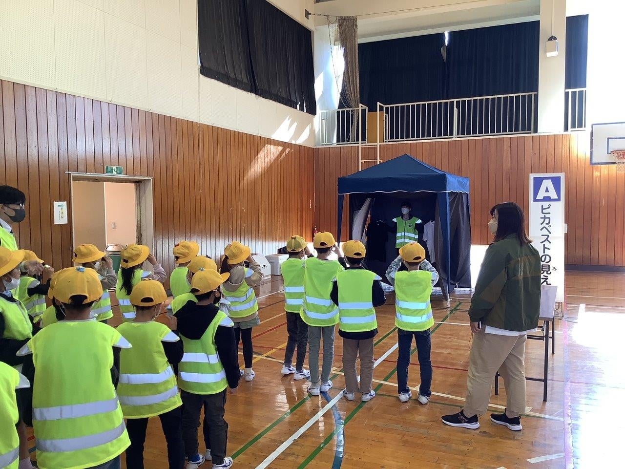 チクマは④児童向け高視認性安全服「みとちゃんピカベスト」の効果についてのプログラムを受け持ち、高視認性安全服を着用すると周囲からどのように見えるのか、動画や実際にピカベストに光を当てる体験などをしてもらいました。
