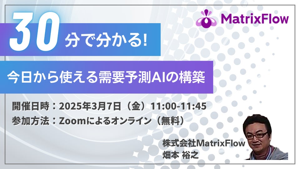 株式会社MatrixFlow(本社:東京都、代表取締役:田本芳文)は、本日、同社が提供するAIプラットフォーム「MatrixFlow」による、需要予測AIの常識を覆す「30分で分かる!今日から使える需要予測AIの構築」セミナーを開催いたしますのでお知らせ申し上げます。