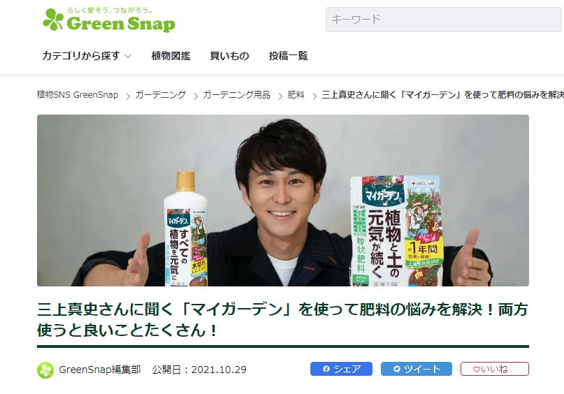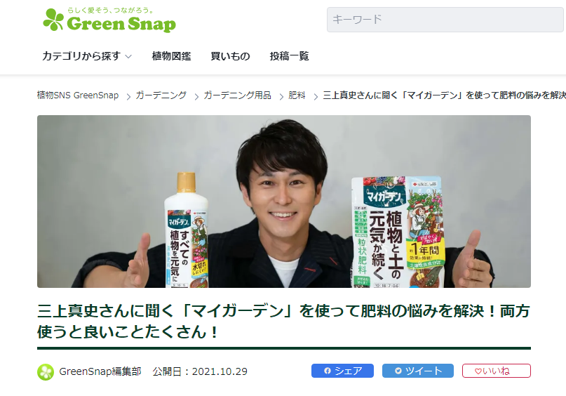 季節に合わせた商品の紹介記事だけでなく、GreenSnapアンバサダーの三上真史氏とのタイアップ記事を実施し、「マイガーデン」の魅力や使用感などを使用シーンの写真を用いて三上氏の目線で紹介。ファン層だけでなくビギナーや30〜40代への訴求に成功し、2021年4月に公開した記事では3万PV以上獲得した人気記事もありました。