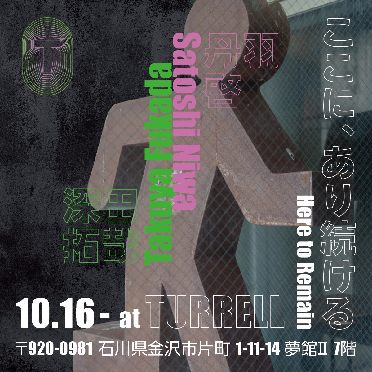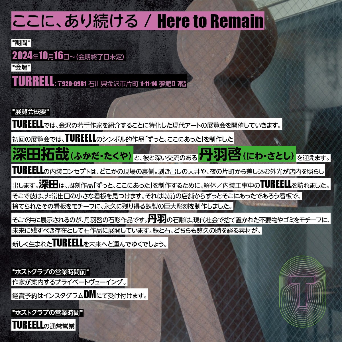初回の展覧会は10月末を予定、TURRELLのシンボルである彫刻作品「ずっと、ここにあった」を制作した深田拓哉(ふかだ・たくや)と、彼と深い交流のある丹羽啓(にわ・さとし)を迎えます。