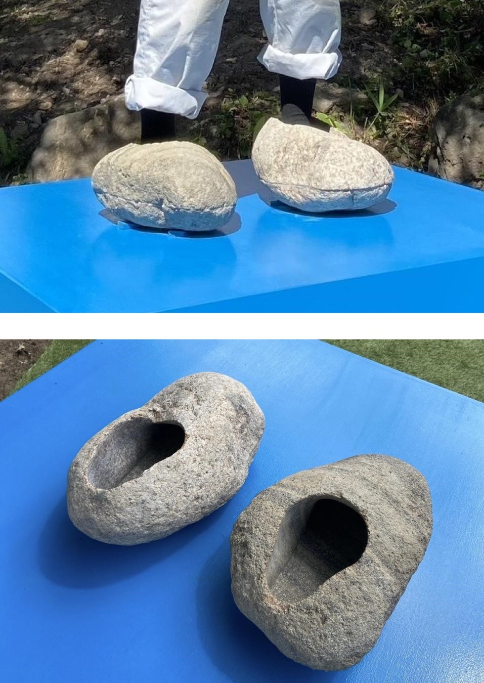 川石を靴のように履くことができる作品。自然環境や大地と共に生きていることを体感することができる。この石靴は作者の足のサイズぴったりに合わせて作られており、足にぴったりフィットしたら運命の出会いを感じてください。