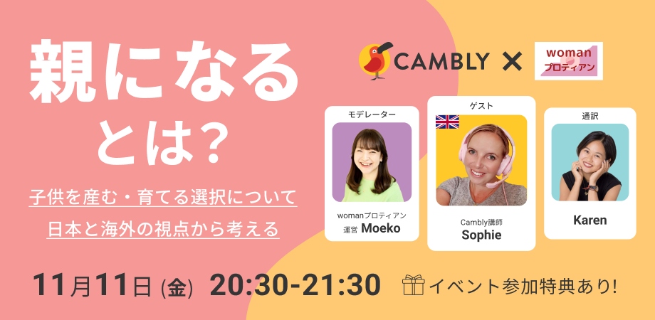 この度、女性にとって大きな選択のひとつである「子どもを産む・育てる」ことをテーマにした、女性のためのサードプレイスを提供するwomanプロティアンとのコラボイベントを開催します。イギリス出身・スペイン在住のCambly講師であり、子を持つ母であるSophie先生の経験を聴きながら、子どもを産む・育てるという選択肢について、正解のない問いではありますが、一緒に考える時間を持てたらと思います。