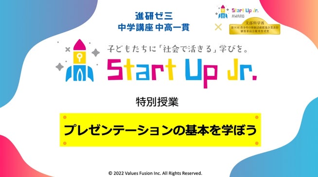 なお「進研ゼミ中学講座中高一貫」は、当社が主催する小中学生を対象とした国内最大規模の社会課題解決型プレゼンテーション大会「スタートアップJr.アワード」にも協賛いただくことで、プレゼンテーション教育の学びの入り口から、成果を発揮できる場までを一貫して整えることで、当社と共に「次世代を担う青少年の未来に役立つスキル」の向上を推進してまいります。