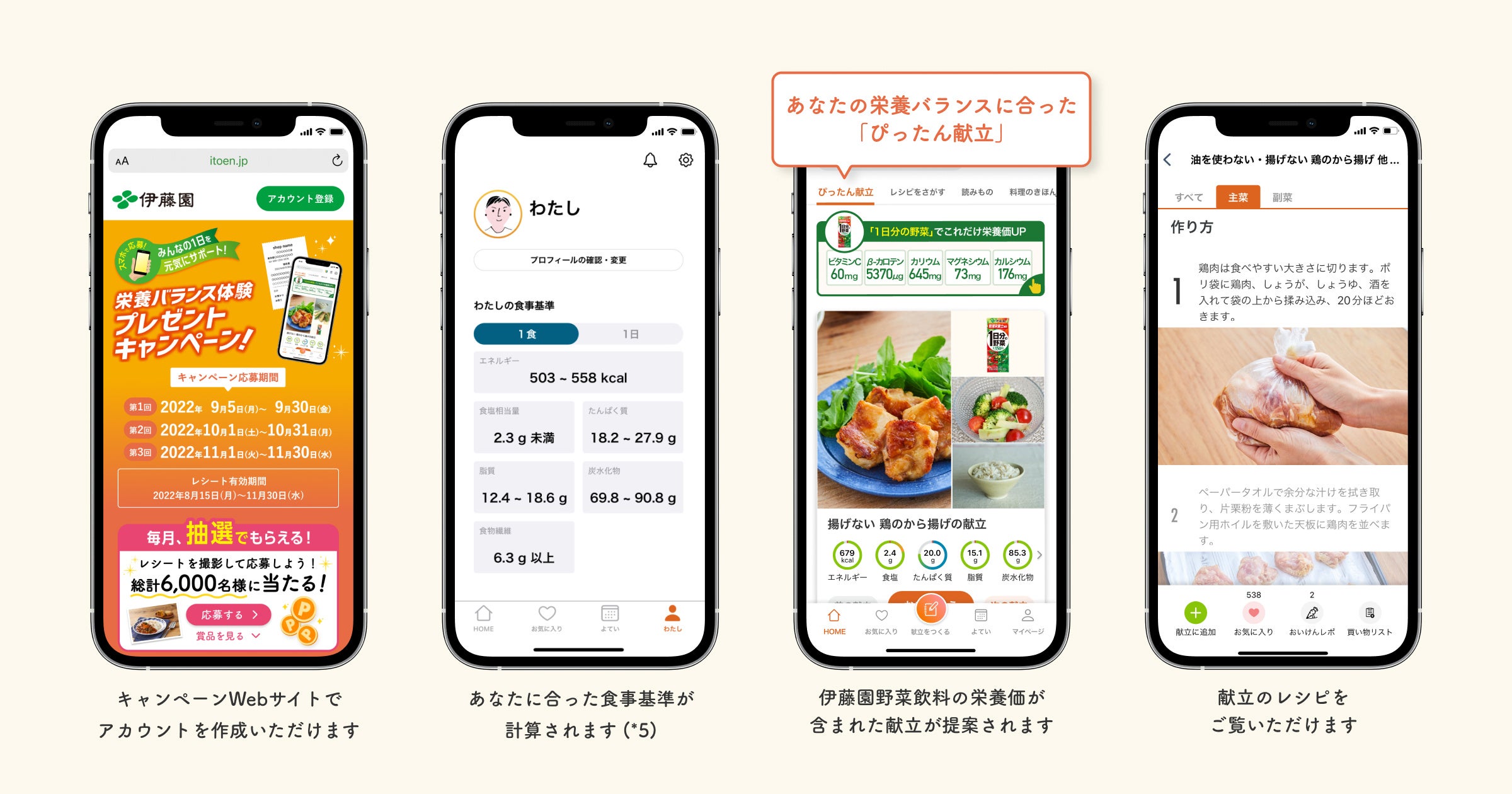 おいしい健康の、パーソナライズ献立提案機能「ぴったん献立」のうち、日本人の食事摂取基準(*5)に準拠した献立提案コースに、伊藤園野菜飲料商品(*6)を織り込み、栄養価計算がされた特別献立が提案される期間限定のコースです。