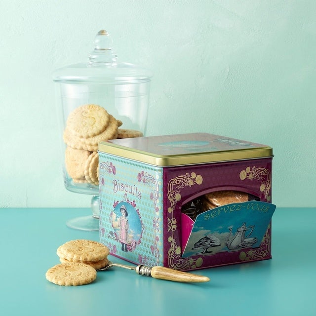 箱の扉からもサブレを取り出せる、宝箱のようなワクワクする仕掛けが楽しいクッキー缶。ピュアバターのフレーバーが好評です。フランス人形や木馬が描かれたアンティーク風のデザインがどこか懐かしく感じる一品です。