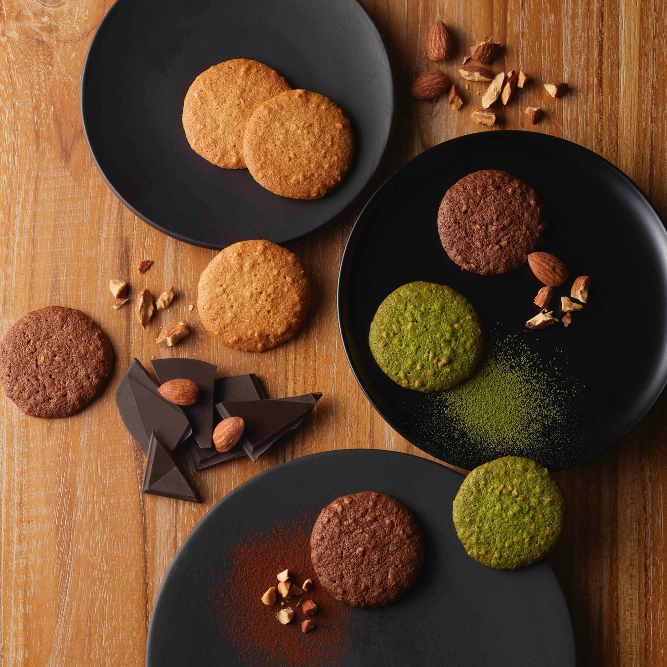 シンプルなアーモンド味、ほろ苦いチョコレートとアーモンドが合わさったチョコアーモンド味、宇治抹茶の風味にアーモンドでアクセントを効かせた抹茶アーモンド味の全3種のクッキー。沖縄県産のさとうきびの原料糖のみで作られた「本和香糖(ほんわかとう)」を使用。まろやかな甘さと、サクッとした食感が特長です。