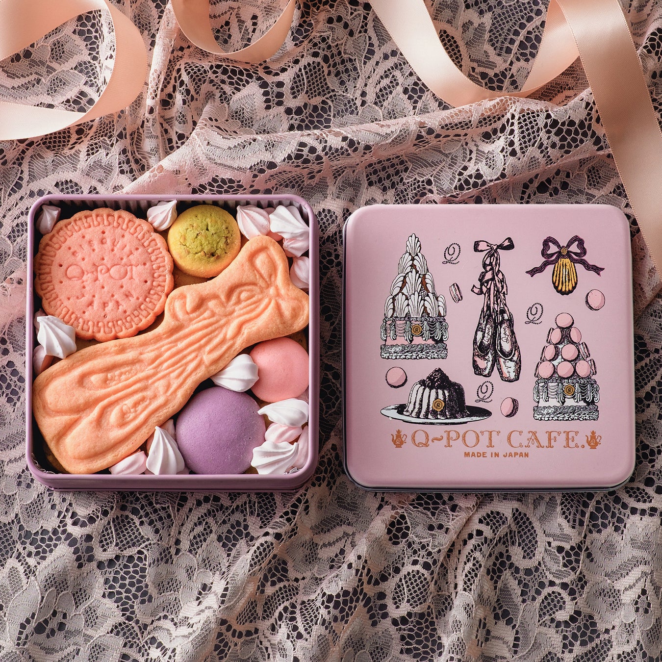 宝石のように美しい、小さな焼き菓子を贅沢に詰め込んだQ-pot CAFE.の「プティ フール セック」。今回の主役はバレリーナが憧れる「トウシューズ」のクッキー。華やかな舞台に舞うバレリーナのように優美に仕上げました。周りにはブルーベリーとフランボワーズのマカロンやピスタチオクッキー、ホイップクリームメレンゲ、ストロベリーミルククッキーが散りばめられています。