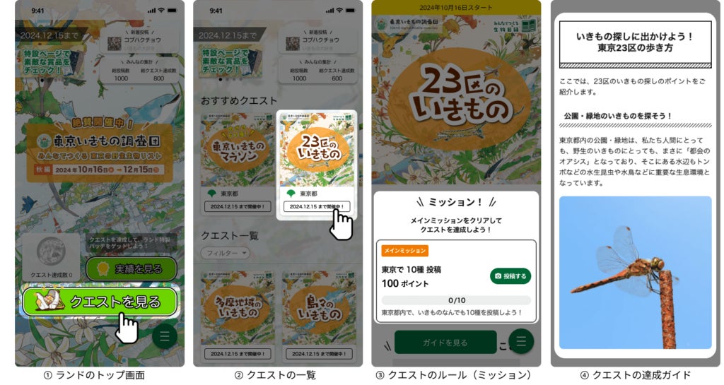 クエストとは、いきもの探しをゲーム感覚で楽しめる機能です。都内で対象のいきものを見つけて投稿することで、クエストが達成できます。初級編から中上級者向けまで、16種のクエストを用意しています。