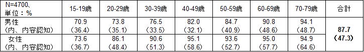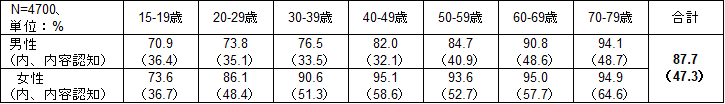 「内容も知っている」は全体で47.3%、性年代別でみると男性では40-49歳が32.1%と最も低く、女性では15-19歳が36.7%と最も低い