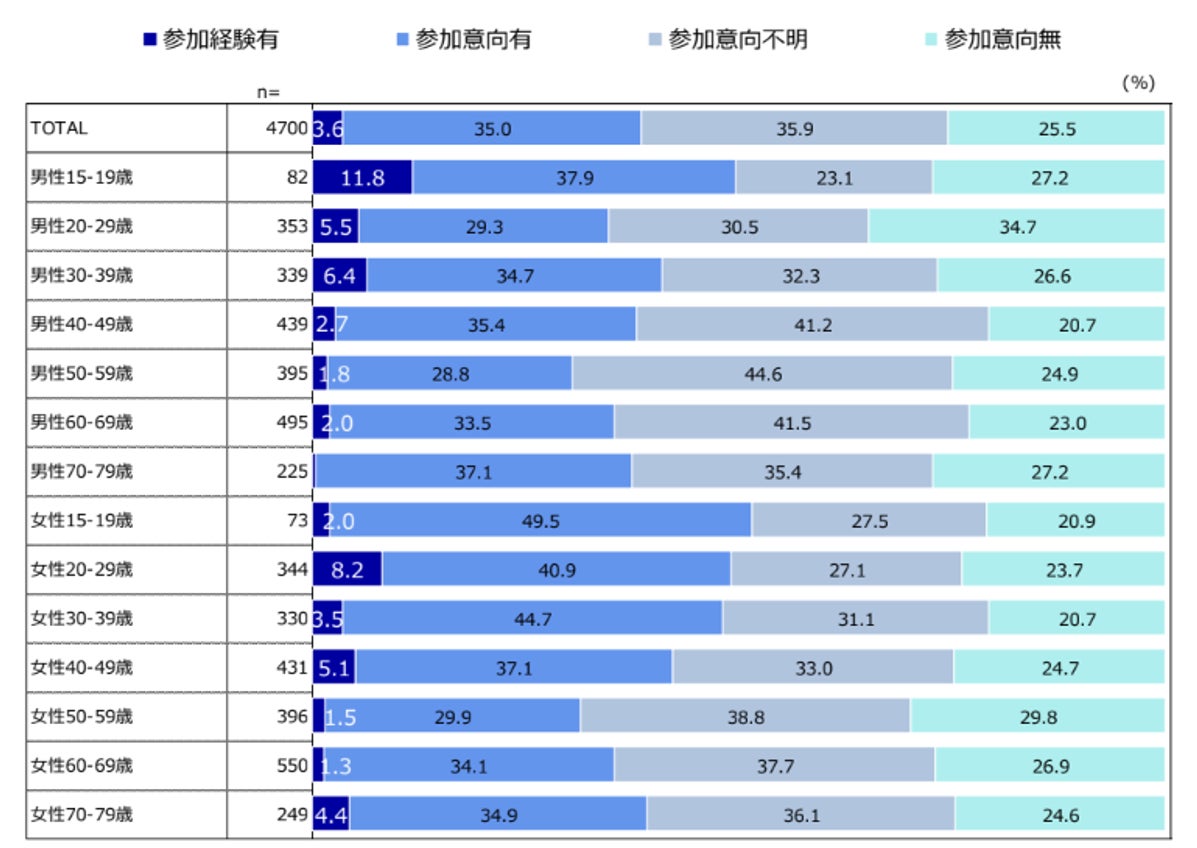 性年代別でみると、「参加経験有」は男性15-19歳で11.8%と最も高く、「参加意向有」は女性15-19歳で49.5%と最も高い。「参加意向無」は男性20-29歳で34.7%と最も高い