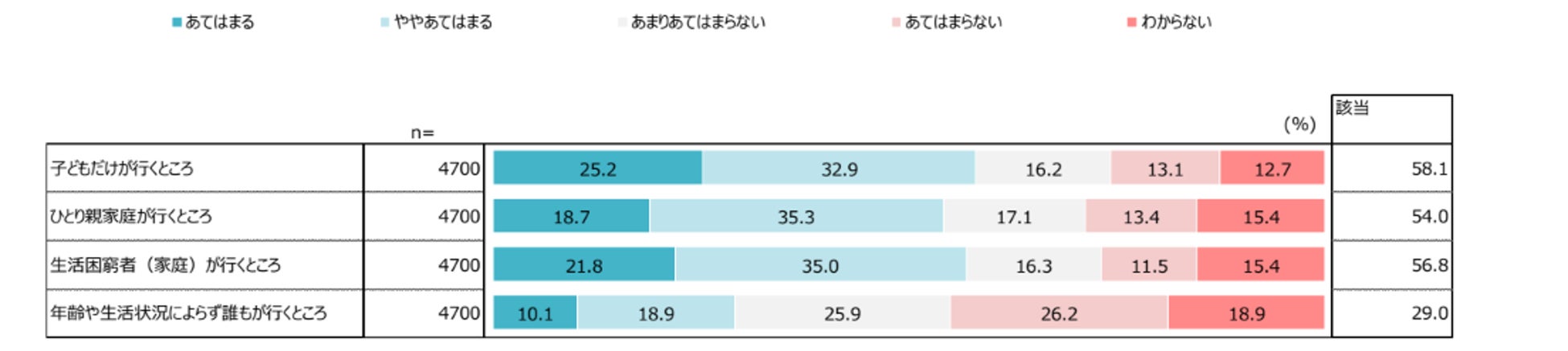 調査の結果、こども食堂についての認知率は87.7%で約9割と高い一方で、その内「内容も知っている」人は47.3%に留まりました。また、多くのこども食堂は参加者に条件を付さず、多世代が交流できる居場所となっていますが、利用対象について「年齢や生活状況によらず誰でも」該当すると考える人は29.0%に留まり、こども食堂への「認知」が広がる一方で、その実態はあまり知られておらず、正しい内容の普及が必要であることも明らかとなりました。