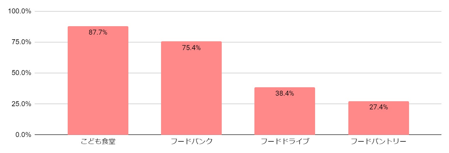 こども食堂の取組に関する認知率は、「こども食堂」が87.7%、「フードバンク」が75.4%、「フードドライブ」38.4%、「フードパントリー」が27.4%