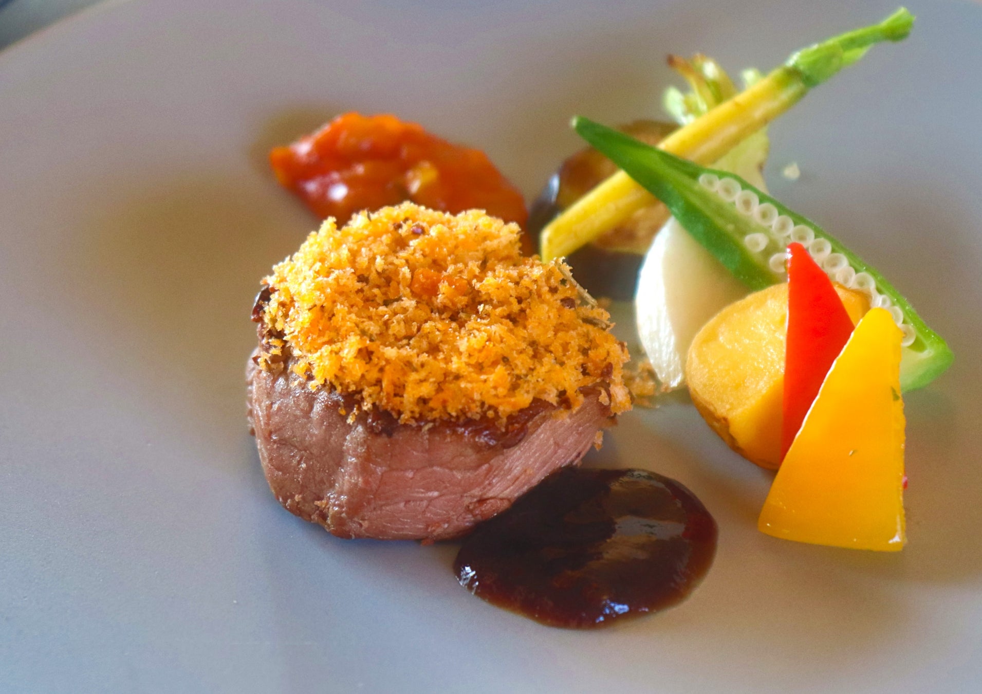メインディッシュは、牛フィレ肉のスパイシーなインパナート仕立て。フィレ肉に、スパイシーなパン粉をまぶして香ばしく焼き上げました。肉の旨味が凝縮されたジュ(肉汁)が、深みのある味わいを添えます。イタリア語で「パン粉焼き」を意味するインパナートは、香ばしい衣とジューシーな肉の組み合わせが絶妙です。地元農園で採れた新鮮な野菜と、トマトでじっくり煮込んだ夏野菜のラタトゥイユを添えてお召し上がり下さい。