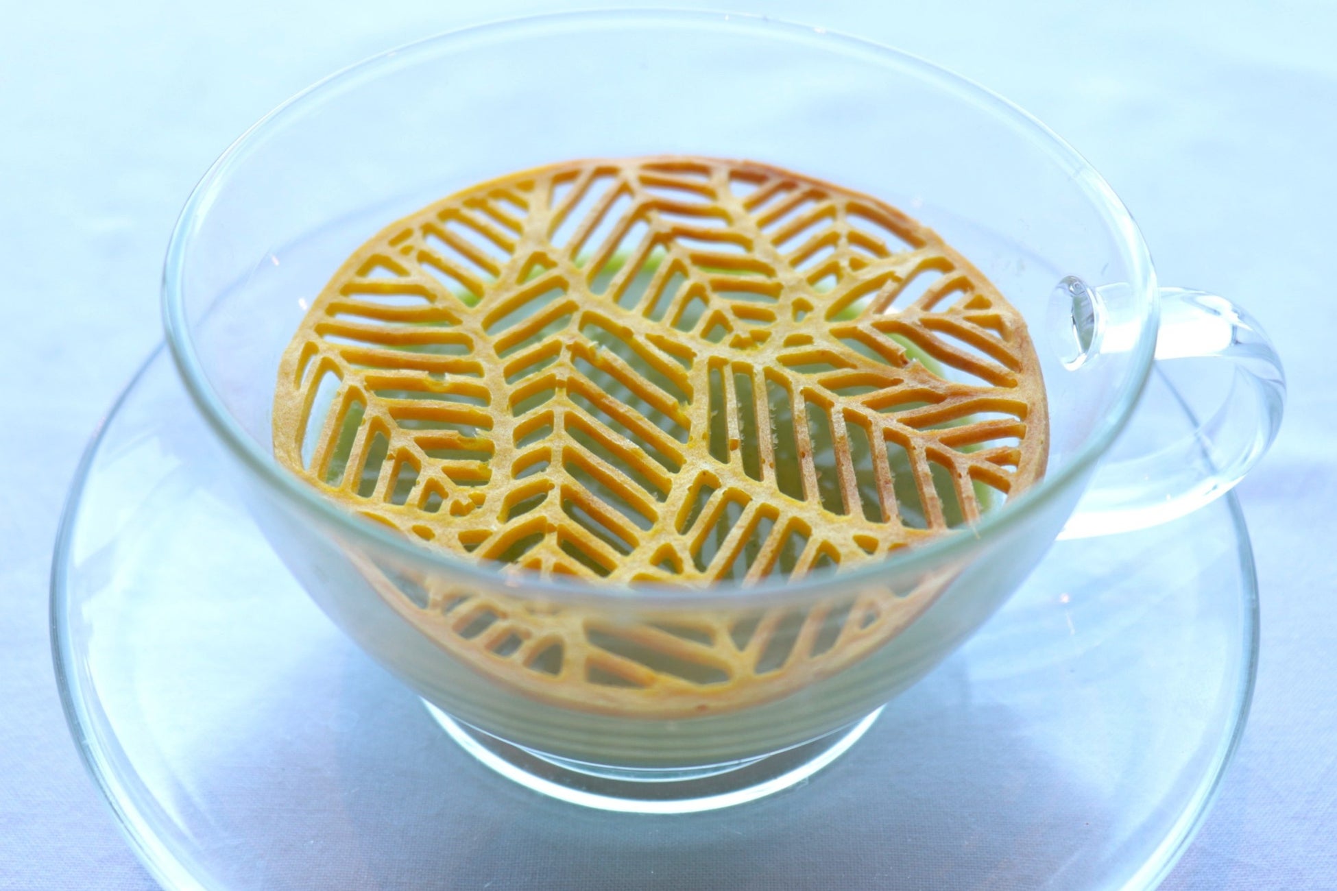 夏の暑さに心地よい、冷たい枝豆のポタージュ。小田原の「いいち味噌」が深みのある塩味のアクセントとなり、枝豆本来の甘みを引き立てます。サフランで色付けされたパリパリとしたチュイールが、液体と固体の異なる食感のコントラストを生み出し、最後まで飽きさせません。
