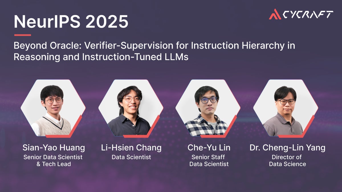 台湾発のサイバーセキュリティ企業 CyCraft は、同社データサイエンスチームによる学術論文 「Beyond Oracle: Verifier-Supervision for Instruction Hierarchy in Reasoning and Instruction-Tuned LLMs」 が、機械学習および計算神経科学分野における世界最高峰の国際会議「NeurIPS 2025」に採択されたことを発表いたしました。本論文は、2025 年 12 月 2 日から 12 月 7 日に米国カリフォルニア州サンディエゴにて開催される同会議にて発表される予定です。