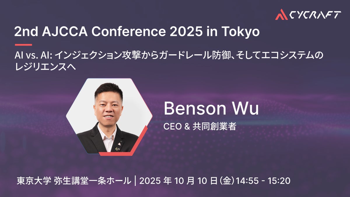 さらに、CyCraft CEO 兼共同創業者の Benson Wu は、2025 年 10 月 10 日に、特定非営利活動法人日本ネットワークセキュリティ協会(JNSA、会長:江崎 浩)が ASEAN Japan Cybersecurity Community Alliance(AJCCA)の後援のもと開催する「第2回 AJCCA カンファレンス 2025 in 東京」に登壇し、本研究に基づく製品のコンセプトや今後の展望について講演を行う予定です。